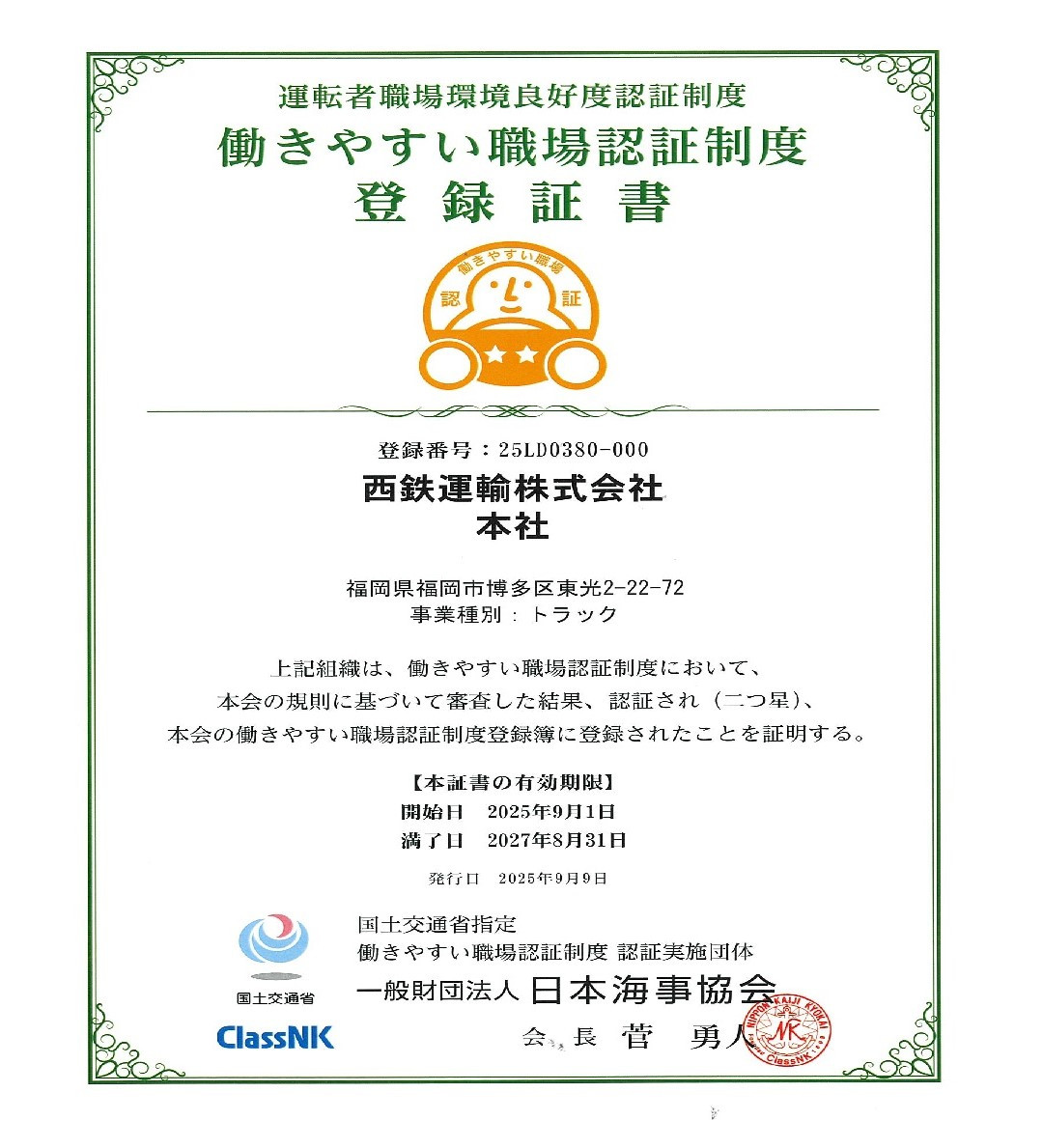 西鉄運輸株式会社では、本社および14事業所で「二つ星認証」を取得しています。働きやすい職場環境認証制度は上記6つの取組要件について基本的な取組要件を満たすことで、「認証事業所」として認定されます。